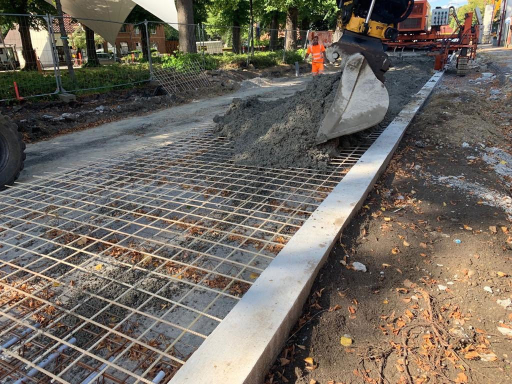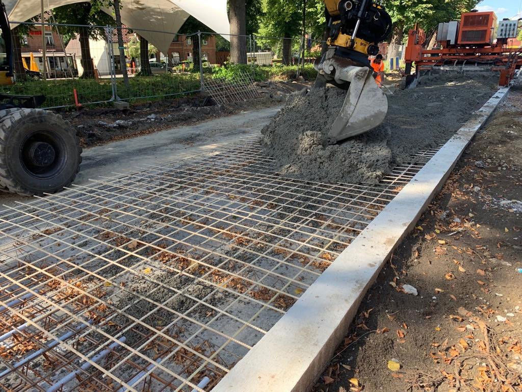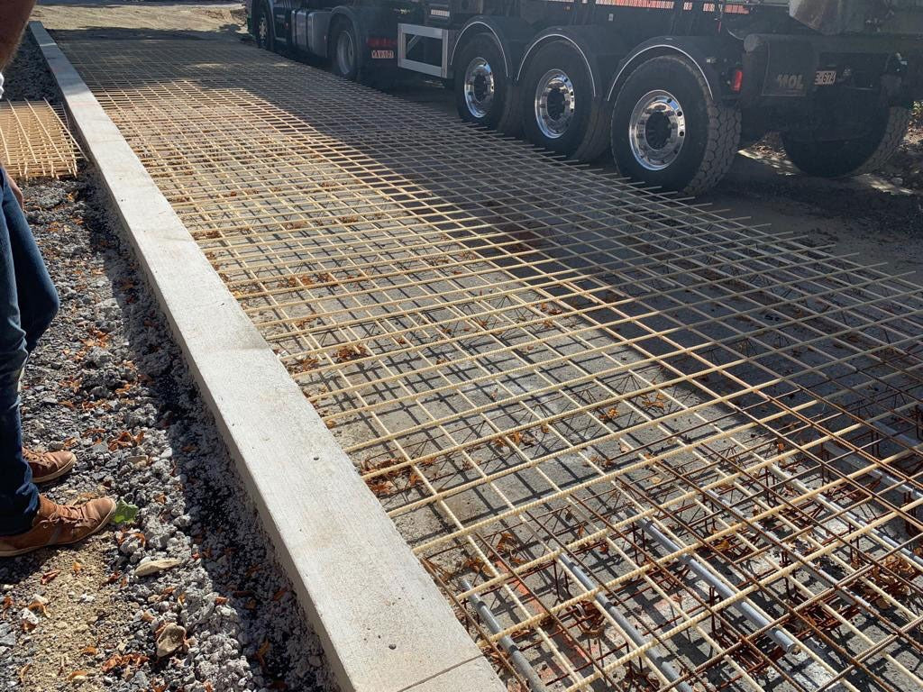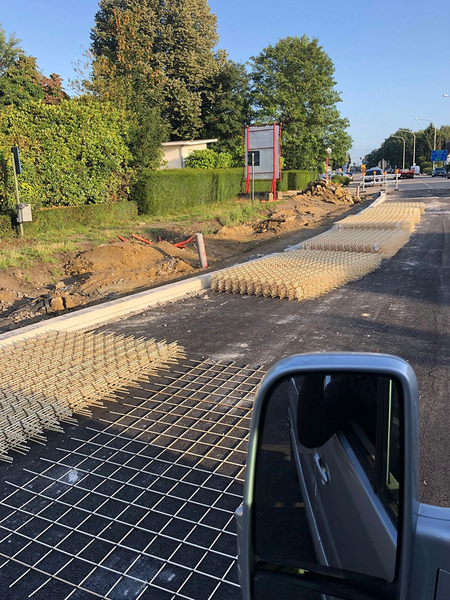 Op een doorgaande weg in België is een nieuwe laag beton aangelegd. Deze weg is gemaakt met een pavermachine. Hier zijn Glasvezelnetten aangeleverd van 3000×2000 / 150×150 / 10 mm. Ook de stalen koppelstaven zijn hier vervangen door glasvezel koppelstaven